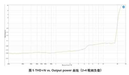 第二步,功放空載不接喇叭,輸入1kHz連續(xù)正弦波信號(hào),掃描THD+N vs. Output Power曲線(xiàn)。在到達(dá)設(shè)計(jì)的最高輸出功率前,THD+N不應(yīng)有明顯增加。