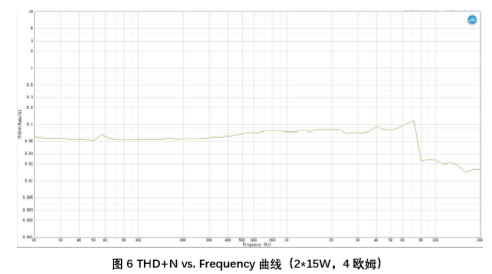 第四步,調(diào)整輸入幅值,使得輸出達(dá)到系統(tǒng)最大輸出功率,以正弦波作為輸入,掃描THD+N vs. Output Power曲線(xiàn)。在整個(gè)音頻帶內(nèi),THD+N不應(yīng)超出系統(tǒng)要求的最大失真(通常為1%),如圖6所示。