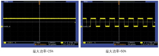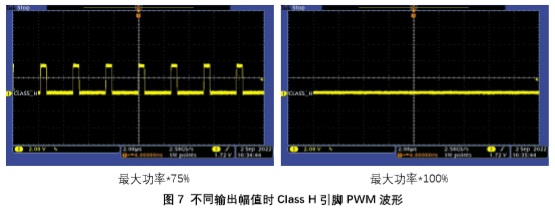 經(jīng)上述兩種方法判斷,如果故障仍然存在,則可以斷開(kāi)功放Class H引腳的所有連接(除了到 DVDD 上拉電阻應(yīng)保留),給到功放不同幅值的輸入信號(hào),用示波器觀察Class H引腳的PWM輸出波形。圖7為幾種不同輸入幅值時(shí),PWM的占空比變化情況。