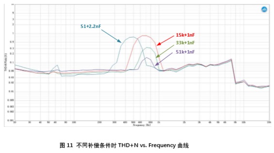 考慮到 ESR 零點(diǎn)與負(fù)載主極點(diǎn)距離較遠(yuǎn),在保持環(huán)路穩(wěn)定的前提下,補(bǔ)償零點(diǎn)越靠近負(fù)載 主極點(diǎn),則環(huán)路帶寬越高,動(dòng)態(tài)響應(yīng)越好。這表現(xiàn)為重載條件到來(lái)時(shí)boost能夠快速響應(yīng),其輸出電壓不會(huì)跌落太大,發(fā)生削波失真。圖11為輸出功率為2*18W,其他測(cè)試條件相同,上述三組補(bǔ)償參數(shù)所對(duì)應(yīng)的THD+N vs. Frequency掃描結(jié)果?梢(jiàn)經(jīng)過(guò)恰當(dāng)補(bǔ)償?shù)腷oost環(huán)路, 可以有效改善削波失真。