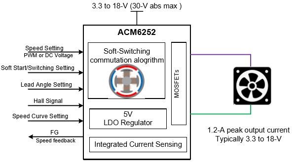 ACM6252是一款外置霍爾傳感器的單相無(wú)刷電機(jī)驅(qū)動(dòng)IC。內(nèi)部集成電機(jī)控制算法和電流檢測(cè),能夠基于霍爾信號(hào)控制單相無(wú)刷電機(jī)靜音/ 高效旋轉(zhuǎn)。內(nèi)部集成4 顆小于500mΩ 的 MOS保證1.2A電流輸出的情況下優(yōu)異的熱性能。 一顆5mm× 4.4mm的 TSSOP(16)封裝;不到10顆阻容即可覆蓋大多數(shù)中小功率(<1A)的風(fēng)機(jī)、泵機(jī)類應(yīng)用。