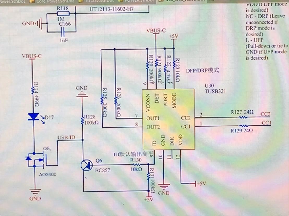 Type-C接口的方案是需要芯片來(lái)檢測(cè)U盤等設(shè)備的正反插,所以就用到了TUSB321芯片來(lái)檢測(cè)CC腳的變化,然后產(chǎn)生一個(gè)ID的信號(hào)給BQ25896(電路如下圖),這款芯片也有個(gè)ID識(shí)別腳一但識(shí)別到TUSB321給的信號(hào)之后,就會(huì)產(chǎn)生一個(gè)反向輸出電壓給外部設(shè)備供電。