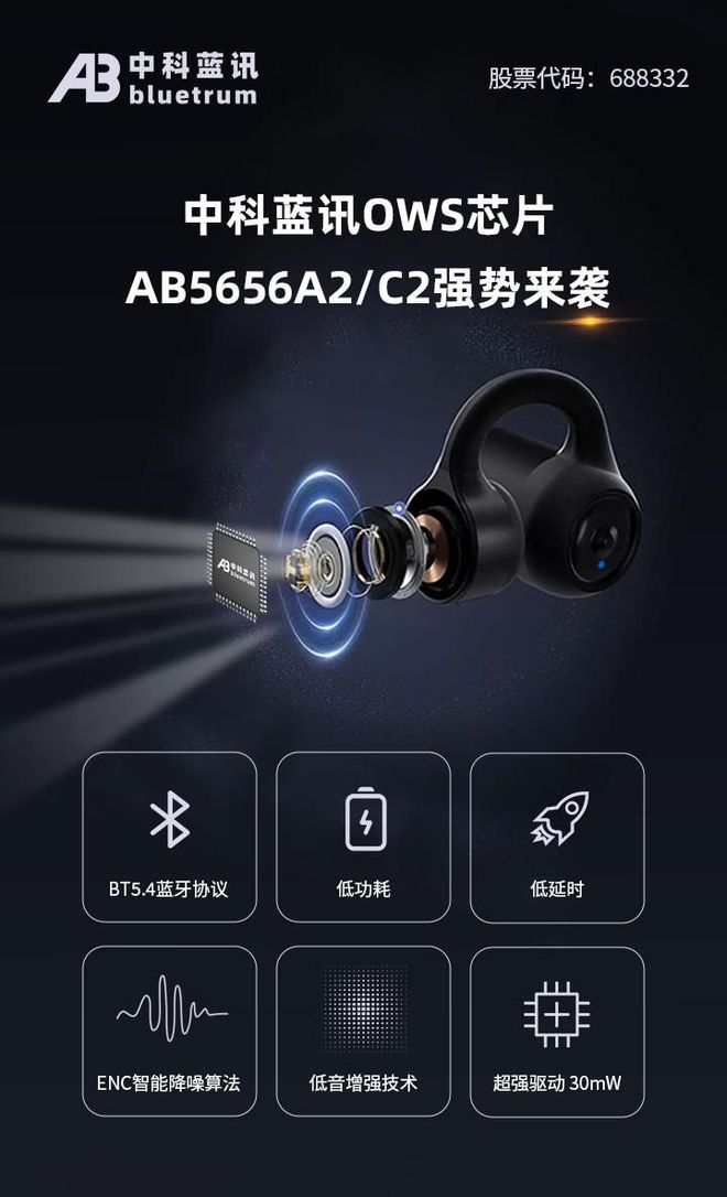 中科藍訊推出新款應(yīng)用于無線藍牙耳機的藍牙音頻芯片AB5656A2/C2,支持藍牙5.4連接協(xié)議,適用于OWS耳機。