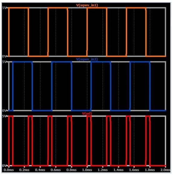 這兩個(gè)方波具有較小的相位差,因此它們在周期的一小部分內(nèi)處于不同的邏輯狀態(tài)。當(dāng)邏輯狀態(tài)不同時(shí),XOR 輸出為高電平。如果相位差變大,XOR 輸出在邏輯高電平上花費(fèi)更多時(shí)間: