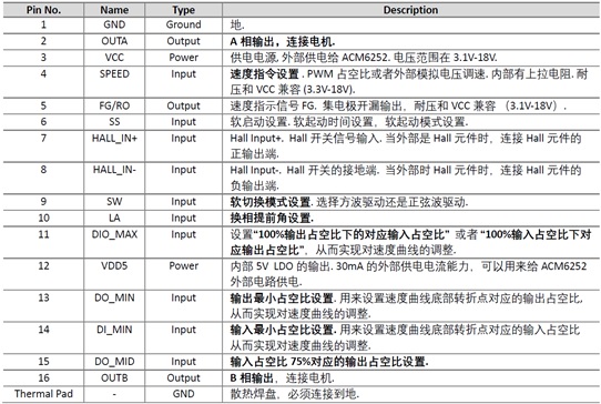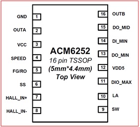 ACM6252是一款外置霍爾傳感器的單相無刷電機驅(qū)動IC。內(nèi)部集成電機控制算法和電流檢測,能夠基于霍爾信號控制單相無刷電機靜音/ 高效旋轉(zhuǎn)。內(nèi)部集成4 顆小于500mΩ 的 MOS保證1.2A電流輸出的情況下優(yōu)異的熱性能。TSSOP-16封裝,管腳兼容APX9230/M8121;外圍極其簡單,不到10個阻容