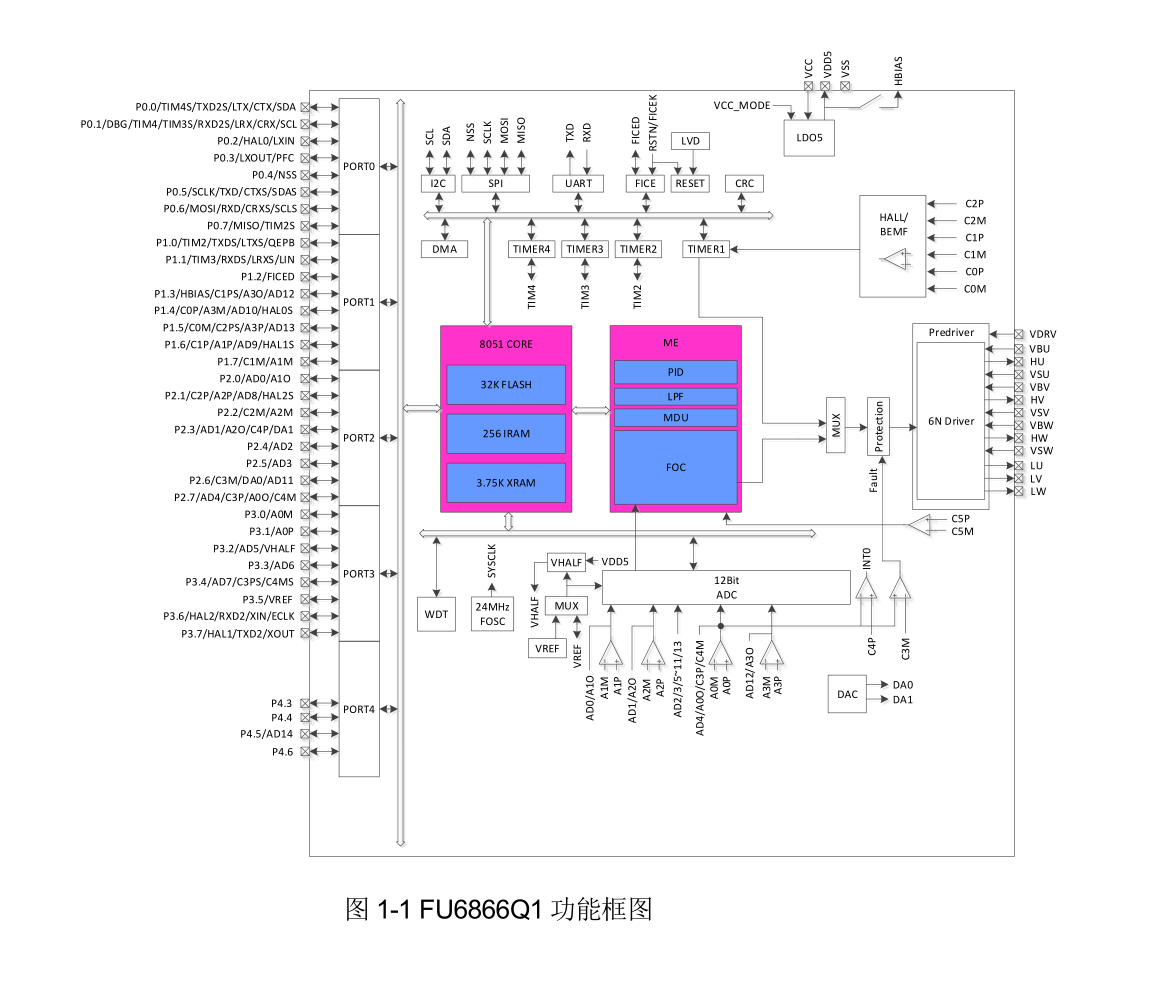 FU6866Q1芯片內(nèi)部集成有LIN通信、LIN收發(fā)器、CAN通信、內(nèi)置Pre-driver、高壓LDO、高速比較器、高速運(yùn)放、ADC、DAC、CRC、I2C、UART、DMA、TIMER等功能模塊、耐高壓IO等,集成ME電機(jī)控制內(nèi)核,包含硬件FOC功能模塊、方波功能模塊、PI、LPF、MDU等。芯片集成度高,可以有效減少外圍器件和BOM成本,可以更快完成整體方案設(shè)計(jì)。