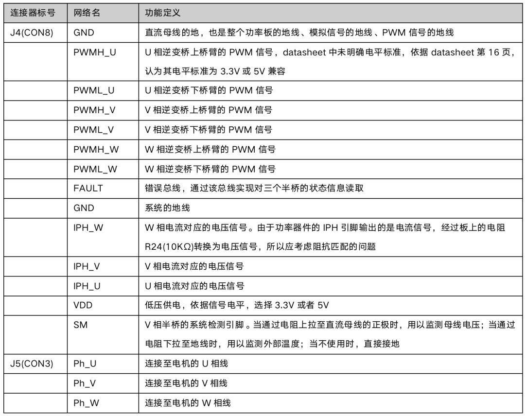 此外,該評(píng)估板的關(guān)鍵電信號(hào)主要包括:半橋功率器件,相電流與電流信號(hào)的對(duì)應(yīng)關(guān)系為400uA/A,電流信號(hào)轉(zhuǎn)電壓信號(hào)所使用的電阻值為10KΩ,對(duì)應(yīng)電壓信號(hào)為4V/A,該半橋最大輸出電流為0.7A,對(duì)應(yīng)最大輸出電壓為2.8V;半橋的上橋臂使用的PWM信號(hào)為低邏輯,即當(dāng)該P(yáng)WM信號(hào)為低時(shí),對(duì)應(yīng)上的上橋臂導(dǎo)通;器件ID,逆變橋使用三個(gè)半橋功率器件,該三個(gè)半橋使用同一根FAULT_BUS信號(hào)與微控制器通信,因此需要設(shè)置每個(gè)半橋的通信識(shí)別ID,通過(guò)將半橋功率器件的ID引腳分別:連接至BPL引腳、懸空、連接SG引腳共三種方式來(lái)設(shè)置三個(gè)ID,微控制器具有默認(rèn)的ID,因此無(wú)需設(shè)置。