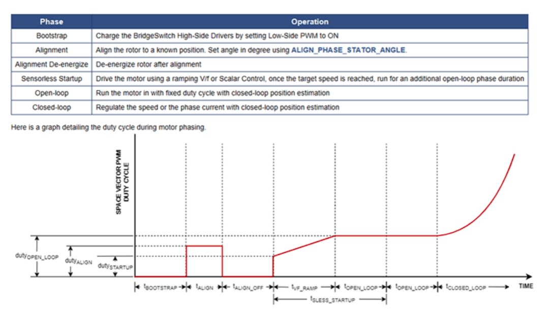 Sensorless Startup階段:此階段通過(guò)開環(huán)拖動(dòng),使電機(jī)轉(zhuǎn)速逐漸提高至設(shè)定的轉(zhuǎn)速值。