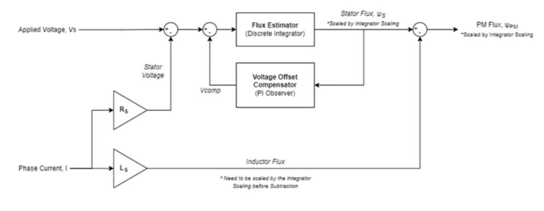 磁鏈觀測(cè)器原理如下圖所示。Vs即控制器的輸出電壓,減去電機(jī)電流×電機(jī)電阻,理想情況下,為電機(jī)的反電動(dòng)勢(shì)+電機(jī)電感的電壓,通過(guò)該電壓計(jì)算得到總的磁鏈,并減去由電流+電感產(chǎn)生的磁鏈,即可得到電機(jī)轉(zhuǎn)子的磁鏈。由此可以看出,當(dāng)電機(jī)轉(zhuǎn)速過(guò)小,將導(dǎo)致反電動(dòng)勢(shì)過(guò)小,信噪比過(guò)小,影響觀測(cè)效果。同時(shí)可以看出,電機(jī)電感、電阻、永磁體磁鏈等參數(shù)也將影響觀測(cè)器的結(jié)果的準(zhǔn)確性。