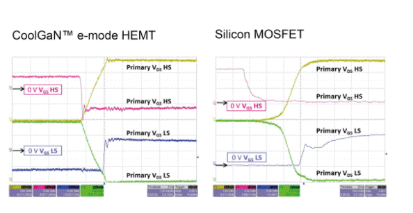 當(dāng)使用Si MOSFET實(shí)施時(shí),由于在功率器件關(guān)閉和打開時(shí)輸出處的非零電壓,硬開關(guān)模式會(huì)導(dǎo)致體二極管中產(chǎn)生電荷積聚。隨后需要建立的反向恢復(fù)電荷(Qrr)需要放電,并且需要將其時(shí)間納入PWM控制實(shí)現(xiàn)中。在利用GaN的設(shè)計(jì)中,這不是問題,因?yàn)檫@些晶體管沒有固有的體二極管,因此沒有Qrr。這樣的結(jié)果是總體上更高的效率,失真度的改善以及更清晰的開關(guān)波形。