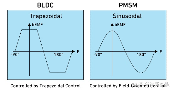 BLDC和PMSM電機(jī)根據(jù)同步電機(jī)的原理工作。轉(zhuǎn)子在每次換向時(shí)繼續(xù)追逐定子,因此電機(jī)連續(xù)運(yùn)動(dòng)。然而,這兩種直流電機(jī)的定子繞組具有不同的幾何形狀,因此它們會(huì)產(chǎn)生不同的反電動(dòng)勢(shì)(BEMF)響應(yīng)。BLDC BEFM是梯形的。PMSM電機(jī)具有正弦BEMF,因此線圈繞組以正弦方式纏繞。為了最大限度地提高性能,這些電機(jī)通常使用正弦波換向。