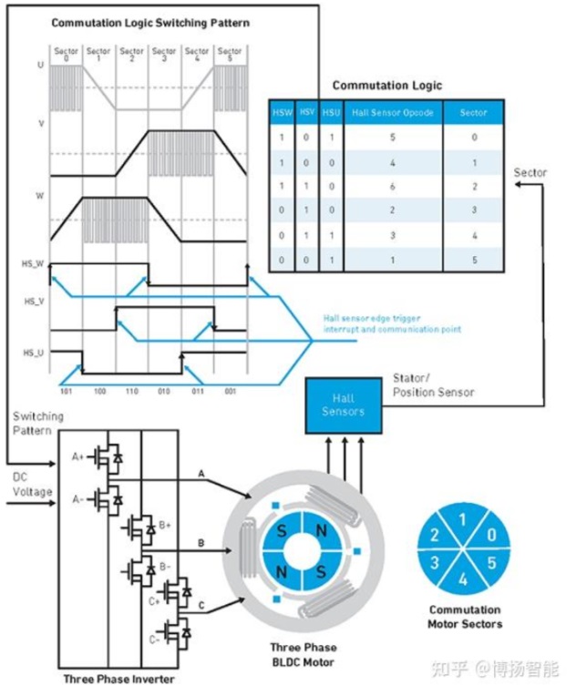 三相BLDC電機(jī)有六個(gè)狀態(tài)。如下圖所示,三位代碼可用于表示1到6之間的操作碼編號(hào)。放置傳感器以使用八個(gè)操作碼中的六個(gè)(1到6)提供三位數(shù)據(jù)輸出。此信息很有用,因?yàn)榭刂破骺梢源_定何時(shí)發(fā)出了非法操作碼并根據(jù)合法操作碼(1到6)采取行動(dòng)。如下所示,該算法獲取霍爾傳感器操作碼并對(duì)其進(jìn)行解碼。當(dāng)霍爾傳感器操作碼的值發(fā)生變化時(shí),控制器改變通電方案以實(shí)現(xiàn)換向。微控制器使用操作碼從查找表中提取通電信息。在三相逆變器用新的扇區(qū)命令通電后,磁場(chǎng)移動(dòng)到新的位置,推動(dòng)轉(zhuǎn)子隨之移動(dòng)。