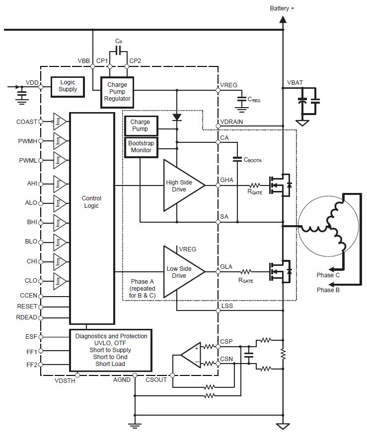 該器件可實現(xiàn)對三相橋中所有六個功率 FET 的全面控制,從而可通過塊整流或正弦激勵驅(qū)動電動機(jī)。集成交叉控制與電阻可調(diào)無感時間可使功率 FET 免于擊穿。