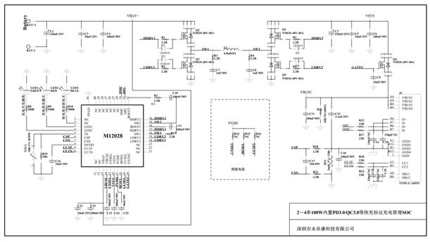 取電協(xié)議芯片與充電頭(Source) 進(jìn)行協(xié)商,Type-C通過控制信號輸出協(xié)商電壓,然后充電管理多串鋰電池或其它類型電池充電。深圳市永阜康科技有限公司現(xiàn)在大力推廣內(nèi)置PD3.0/QC3.0等主流快充協(xié)議2-4節(jié)100W升降壓鋰電充電管理芯片M12028,可支持2-4串鋰電池快速充電,滿足多串大容量鋰電池組應(yīng)用場合。高度集成的芯片設(shè)計(jì),外圍元件少,應(yīng)用簡單,直接使用Type-C充電,無需專用充電器、避免資源浪費(fèi)。