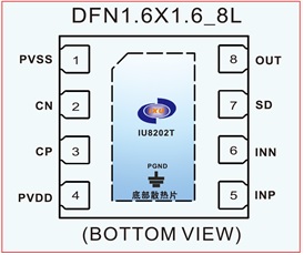 IU8202T可向16Ω負(fù)載提供高達(dá)400mW輸出功率,THD+N僅為0.006%。217Hz時具有86dB的高電源抑制比(允許該器件工作在嘈雜的數(shù)字電源,無需額外的線性穩(wěn)壓器件)。精巧的咔嗒聲抑制電路消除了啟動與關(guān)斷過程中的可聞噪聲。低功耗關(guān)斷控制,可以在混聽模式有效的節(jié)省能源。IU8202T工作電壓范圍在2.5~5.5V, 待機(jī)時僅消耗1.3mA電源電流, 具有短路保護(hù)與熱過載保護(hù) .IU8202T封裝形式為DFN1.6X1.6_8L,其額定的工作溫度范圍為-40℃至85℃。