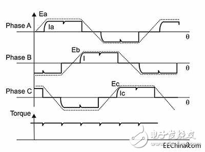 圖 2: 使用梯形控制的三相 BLDC 電機(jī)的電波形。 請(qǐng)注意,發(fā)生轉(zhuǎn)向時(shí)每個(gè)相位的驅(qū)動(dòng)電流輕微下降。 這會(huì)引起電機(jī)扭矩中的波紋。 虛線記錄了每個(gè)相位中反電動(dòng)勢(shì)的梯形圖,其中過(guò)零點(diǎn)與相位的浮動(dòng)周期中間點(diǎn)重合。