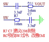 5、SW上RC在DEMO中,增加兩組RC,分別為SW到GND和SW到VOUT,目的是減小SW開關(guān)時(shí)候產(chǎn)生的過沖,保護(hù)芯片,同時(shí)可以改善EMI。注意RC封裝,R的封裝不應(yīng)太小,建議1206。