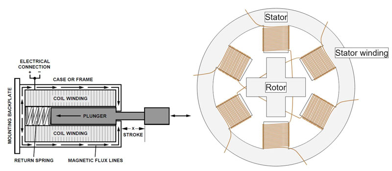 圖 1:螺線管的結(jié)構(gòu)包括帶內(nèi)部滑動柱塞的繞接線圈(左圖);步進(jìn)電機(jī)則更為復(fù)雜,轉(zhuǎn)子上有永磁體,定子上有電磁線圈(右圖)。(圖片來源:Analog Devices、Monolithic Power Systems)