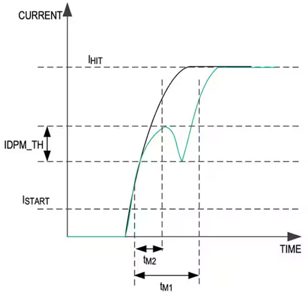前四項(xiàng)是眾所周知的標(biāo)準(zhǔn)功能。DPM 則需要進(jìn)一步解釋。舉例而言,在螺線管控制的閥門中,如果螺線管啟動時閥門工作正常,則電流分布不是單調(diào)的(圖 3,黑色曲線)。相反,受柱塞運(yùn)動產(chǎn)生的反向電動勢 (BEMF) 影響,電流會出現(xiàn)下降(圖 3,藍(lán)色曲線)。