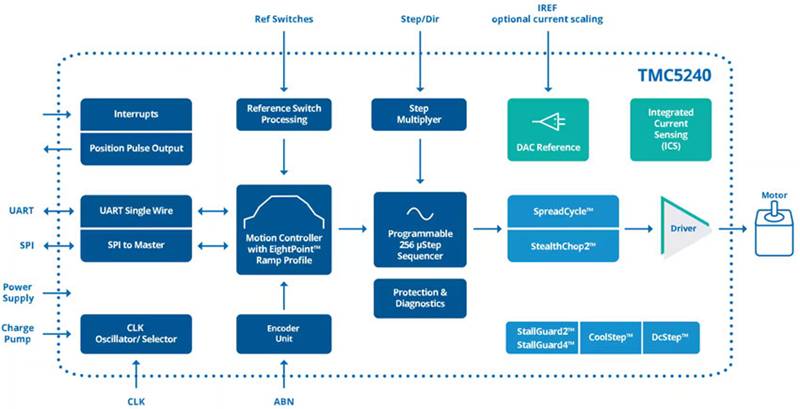 TMC5240 具有獨(dú)特的先進(jìn)功能,可實(shí)現(xiàn)更高的精度,并支持高能效、高可靠性、平滑運(yùn)動以及低溫運(yùn)行。這些功能包括: