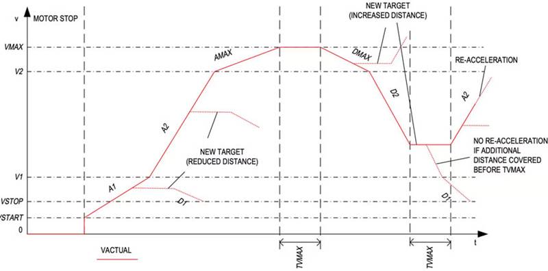 例如,三個加減速段的組合可以有兩種用途:在較低速度下使用較高加速度值以適應(yīng)電機(jī)扭矩曲線,或者在從一個加速段過渡到下一個時減少急動。針對這兩類情況,TMC5240 控制器憑借八點(diǎn)運(yùn)動曲線生成器,可在所需目標(biāo)位置實(shí)時變化的同時保持恒定速度段,從而實(shí)現(xiàn)順暢的模式轉(zhuǎn)換(圖 6)。