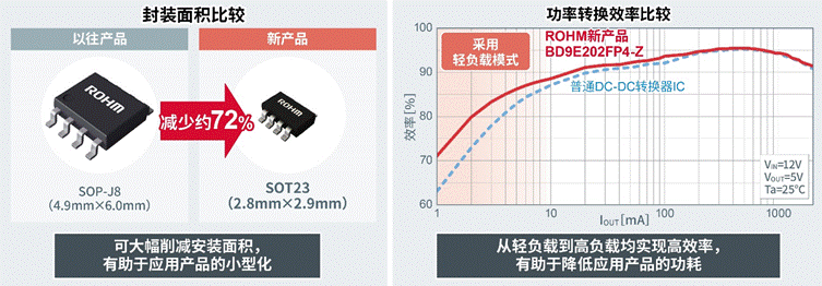 近年來,在消費(fèi)電子和工業(yè)設(shè)備應(yīng)用領(lǐng)域,隨著產(chǎn)品功能的增加,對(duì)節(jié)省電路板空間的要求越來越嚴(yán)格,小型DC-DC轉(zhuǎn)換器IC的使用率也與日俱增。另外,降低待機(jī)功耗已成為亟需解決的一大課題,這就要求DC-DC轉(zhuǎn)換器IC在低功率(輕負(fù)載)時(shí)實(shí)現(xiàn)更高效率。為了滿足這些市場(chǎng)需求,ROHM開發(fā)出比現(xiàn)有SOP-J8封裝產(chǎn)品更小、效率更高的產(chǎn)品。