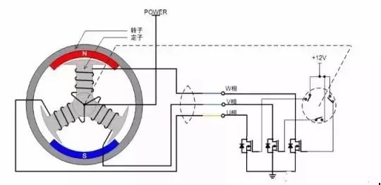 如圖2所示為無刷直流電機的轉動原理示意圖,為了方便描述,電機定子的線圈中心抽頭接電機電源 POWER,各相的端點接功率管,位置傳感器導通時使功率管的 G極接 12V,功率管導通,對應的相線圈被通電。由于三個位置傳感器隨著轉子的轉動,會依次導通,使得對應的相線圈也依次通電,從而定子產(chǎn)生的磁場方向也不斷地變化,電機轉子也跟著轉動起來,這就是無刷直流電機的基本轉動原理——檢測轉子的位置,依次給各相通電,使定子產(chǎn)生的磁場的方向連續(xù)均勻地變化。