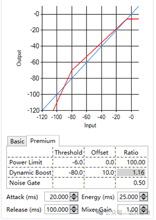 Ratio,單位1,將超過(guò)Threshold的輸入信號(hào)按照Ratio比率進(jìn)行壓縮或放大。
