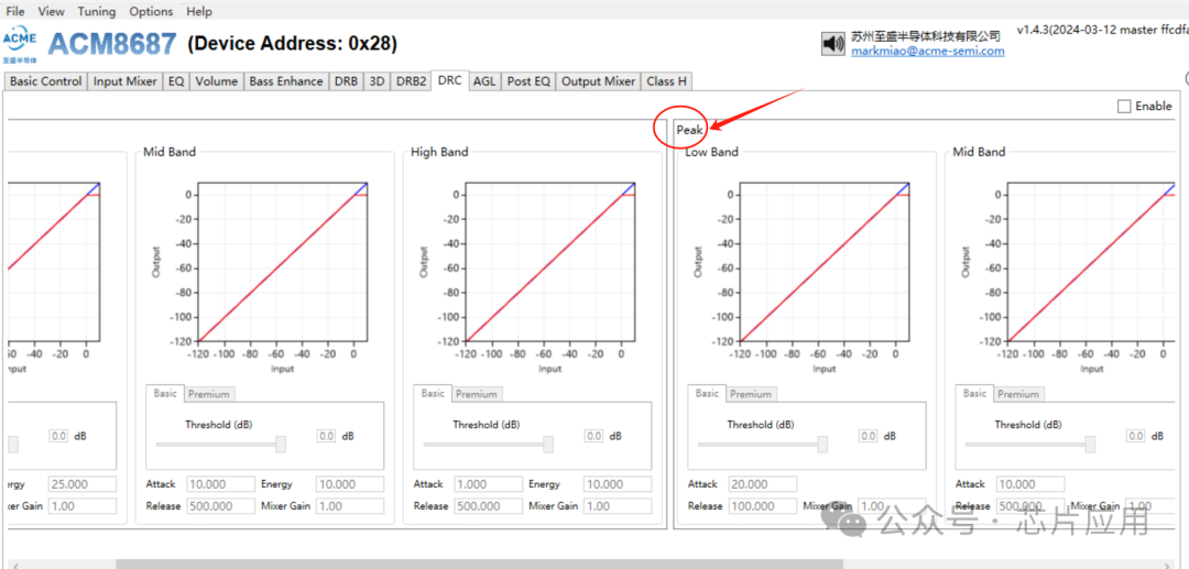 另外一個(gè)弊端例如傳統(tǒng)DRC信號(hào)突變時(shí),前幾個(gè)波形失真的問(wèn)題。由于傳統(tǒng)DRC是計(jì)算RMS,必然有幾個(gè)周期的波形是可能失真的。ACM8687除了RMS DRC之外,采用專利技術(shù),加入PEAK檢測(cè)。信號(hào)經(jīng)過(guò)peak加權(quán)后跟RMS值比較,決定先進(jìn)入peak DRC還是RMS DRC。例如前幾個(gè)波形失真問(wèn)題,可以通過(guò)調(diào)整peak DRC的attack來(lái)調(diào)整失真。