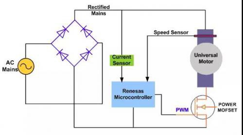 PWM 控制是通用電機(jī)速度控制的,更先進(jìn)的解決方案。在這一解決方案中,功率 MOSFET,或者 IGBT 接通高頻整流 AC 線電壓,進(jìn)而為電機(jī)產(chǎn)生隨時(shí)間變化的電壓。
