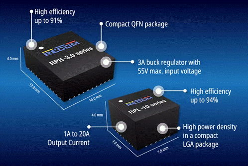 RPH-3.0 系列采用 QFN 封裝,尺寸為 10 × 12 mm,高度為 4 mm,可在 3 A 電流下提供 1 - 15 V 的可調(diào)輸出電壓。輸入電壓范圍為 4.5 - 55 V,效率高達(dá) 91%。例如,在 12 V 輸入電壓和 3.3 V 輸出電壓條件下,可在超過 80 ℃ 的溫度下提供全輸出電流。