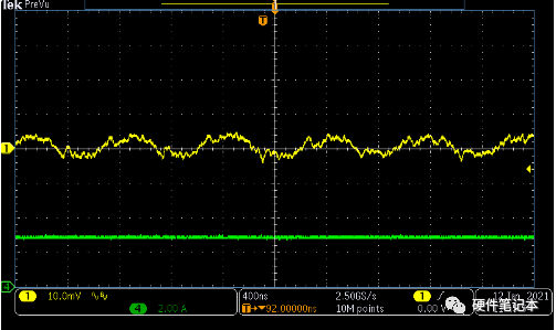 對(duì)于只需要關(guān)心輸出紋波峰峰值大小的應(yīng)用,圖8的結(jié)果已經(jīng)足夠了。但是若想要了解更多紋波的細(xì)節(jié),那么圖8的波形則尚嫌不足。這是因?yàn)槲覀兪褂玫氖浅R?jiàn)的X10倍示波器探頭,真實(shí)的信號(hào)會(huì)先經(jīng)過(guò)1/10分壓進(jìn)入示波器進(jìn)行采樣。在輸入紋波很小,并且經(jīng)過(guò)1/10分壓后,其與示波器的本底噪聲相近,所以圖8的波形上實(shí)際疊加了很多示波器的本底噪聲。