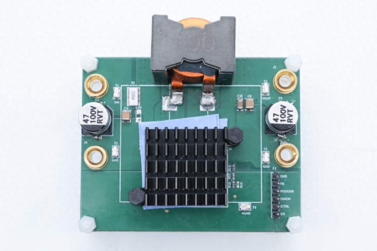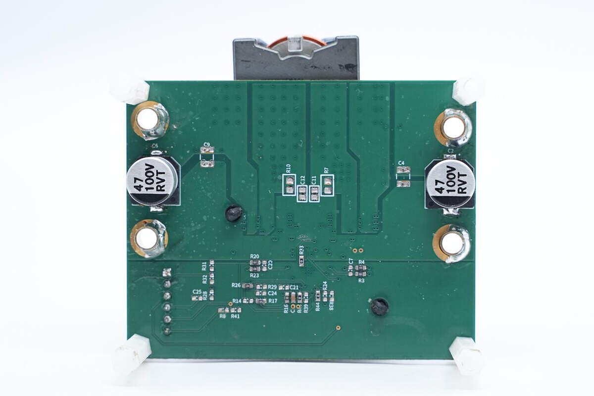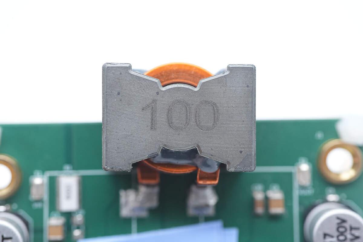 取下覆蓋的散熱片和導(dǎo)熱墊,在下方設(shè)有同步升降壓控制器和氮化鎵開關(guān)管。