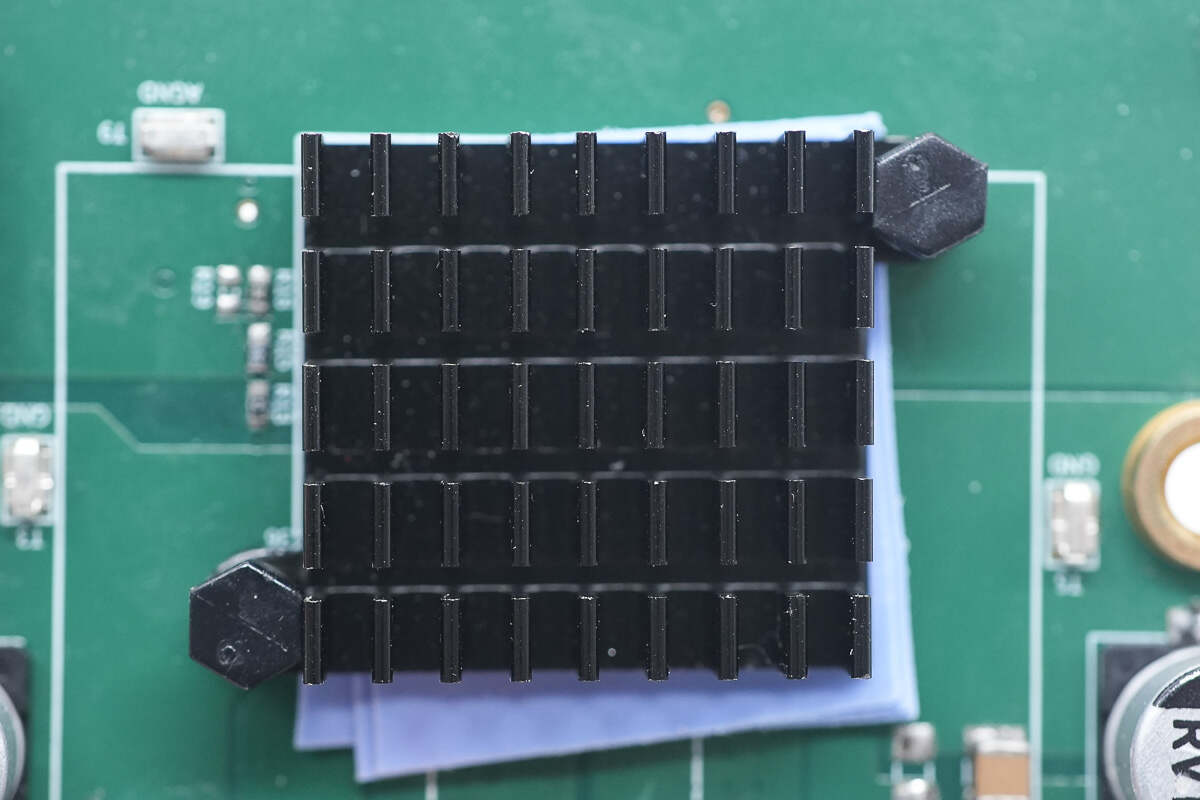 在同步升降壓控制器和氮化鎵開關(guān)管上覆蓋導(dǎo)熱墊和散熱片。