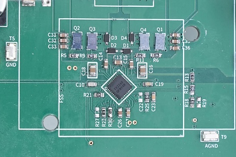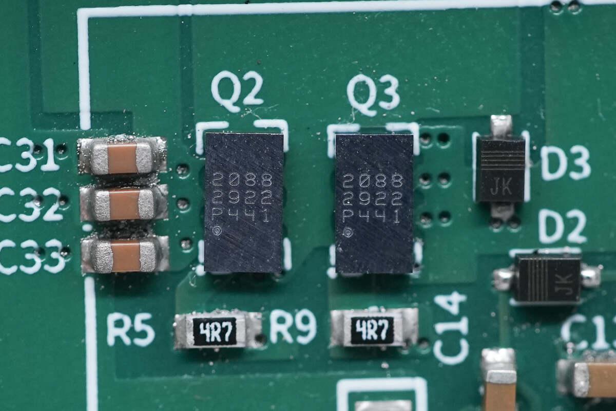 另外兩顆氮化鎵器件型號相同,四顆組成H橋用于同步升降壓電壓轉(zhuǎn)換。