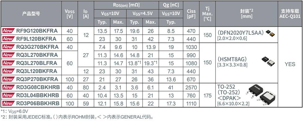 新產品的耐壓分別為40V、60V和100V,均通過采用split gate*3實現(xiàn)了低導通電阻,有助于車載應用的高效運行。所有型號的新產品均符合汽車電子產品可靠性標準AEC-Q101,并確保高可靠性。