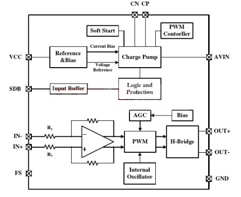 上圖是TA2020的內(nèi)部模塊構(gòu)造,從上圖上可以看出,該芯片內(nèi)部主要集中了處理和調(diào)制模塊,從而實現(xiàn)高品質(zhì)音頻的特性。
