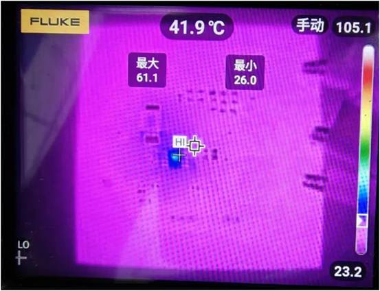 下圖是WD1606S在12V轉5V帶載3A的條件下持續(xù)工作1小時以上的測試圖片。在環(huán)境溫度25度的情況,芯片最高溫度只有61.1度。