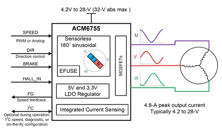ACM6755支持多種驅(qū)動(dòng)方式,包括無(wú)感180゜正弦驅(qū)動(dòng)、無(wú)感方波驅(qū)動(dòng),有感方波/正弦驅(qū)動(dòng)以及開窗正弦驅(qū)動(dòng).其中無(wú)感180゜正弦有效避免因高次諧波導(dǎo)致的電磁音干擾,有感方波/正弦驅(qū)動(dòng)可以有效應(yīng)對(duì)變負(fù)載類應(yīng)用. ACM6755可以根據(jù)用戶提供的電機(jī)參數(shù)進(jìn)行有效啟動(dòng)、加速以及恒轉(zhuǎn)速運(yùn)行.用戶參數(shù)可以通過(guò)燒寫長(zhǎng)期固定(硬件模式,內(nèi)部EEPROM 編程燒寫)或者通過(guò)I2C在線控制(軟件模式,通過(guò)I2C寄存器進(jìn)行參數(shù)初始化或者在線控制)。 ACM6755支持多種速度控制.外部PWM占空比調(diào)速、外部模擬電壓調(diào)速、I2C寄存器調(diào)速以及外部PWM頻率調(diào)速.
