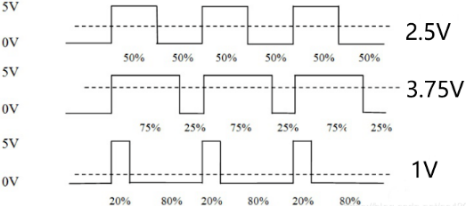 其中,周期是一個(gè)脈沖信號(hào)的時(shí)間,1s內(nèi)的周期T次數(shù)等于頻率f,脈寬時(shí)間是指高電平時(shí)間。上圖中,脈寬時(shí)間占總周期時(shí)間的比例,就是占空比。比方說,周期的時(shí)間是10ms,脈寬時(shí)間是8ms,那么占空比是8/10= 80%,這就是占空比為80%的脈沖信號(hào)。PWM就是脈沖寬度調(diào)制,通過調(diào)節(jié)占空比就可以調(diào)節(jié)脈沖寬度。以STM32單片機(jī)為例,其IO口只能輸出高電平和低電平。假設(shè)高電平為5V、低電平則為0V,那么要輸出不同的模擬電壓就要用到PWM。通過改變IO口輸出的方波的占空比,從而獲得使用數(shù)字信號(hào)模擬成的模擬電壓信號(hào)。電壓是以一種脈沖序列被加到模擬負(fù)載上去的,接通時(shí)是高電平1,斷開時(shí)是低電平0。接通時(shí)直流供電輸出,斷開時(shí)直流供電斷開。通過對(duì)接通和斷開時(shí)間的控制,理論上來講,可以輸出任意不大于最大電壓值5V的模擬電壓。比方說,占空比為50%那就是高電平時(shí)間一半,低電平時(shí)間一半。在一定的頻率下,就可以得到模擬的2.5V輸出電壓。那么75%的占空比,得到的電壓就是3.75V,如下圖所示。