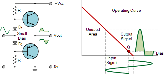 這兩個(gè)晶體管具有非常小的偏置電壓,通常為靜態(tài)電流的 5% 到 10%,以將晶體管偏置到剛好高于其截止點(diǎn)。然后,導(dǎo)電器件(無論是雙極性 FET)將“導(dǎo)通”超過輸入信號(hào)的半個(gè)周期,但遠(yuǎn)少于輸入信號(hào)的一個(gè)完整周期。因此,在 AB 類放大器設(shè)計(jì)中,每個(gè)推挽晶體管的導(dǎo)通時(shí)間略長于 B 類導(dǎo)通的半個(gè)周期,但遠(yuǎn)少于 A 類導(dǎo)通的整個(gè)周期。