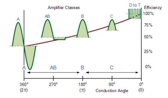 我們?cè)谶@里看到了放大器的多種分類,從線性功率放大器到非線性開關(guān)放大器,并且看到了放大器類別在放大器負(fù)載線上的差異。AB、B和C類放大器可以根據(jù)導(dǎo)通角θ定義如下 |