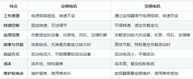定頻電機(jī)和變頻電機(jī)的主要區(qū)別在于其電源頻率的控制方式,進(jìn)而影響它們的工作原理、性能、應(yīng)用范圍和效率等方面。以下是這兩者的詳細(xì)對比: