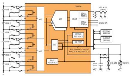 這就是 LTC6804 多電芯電池監(jiān)控器 IC(圖 4)在 Nuvation BMS 實(shí)施中起關(guān)鍵 作用的原因。它專為滿足 BMS 系統(tǒng)和多電芯設(shè)計(jì)需求而定制,可對(duì)多達(dá) 12 個(gè)串 聯(lián)堆疊的電池電芯進(jìn)行精確測(cè)量。其測(cè)量輸入不以接地作為參考,這大大地簡化 了這些單元的測(cè)量,而 LTC6804 本身可進(jìn)行堆疊與高電壓陣列一起使用(它還支 持各種電芯化學(xué)特性)。它提供最大 0.033%誤差和 16 位分辨率,只需要 290μs 即可測(cè)量電池堆棧中的所有 12 個(gè)電芯。這種同步電壓和電流測(cè)量對(duì)于產(chǎn)生有意 義的功率參數(shù)分析至關(guān)重要。