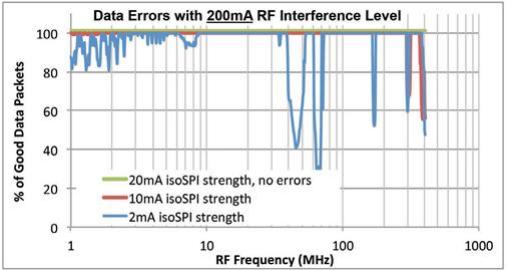 圖 6.LTC6804 和 isoSPI 接口上的測(cè)試結(jié)果顯示,輸入射頻為 200mA ,isoSPI 在 20mA 信號(hào)強(qiáng)度下運(yùn)行時(shí)沒有出現(xiàn)數(shù)據(jù)錯(cuò)誤