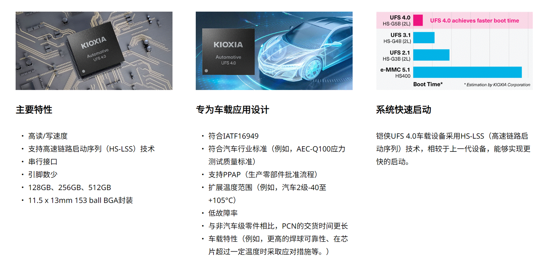 如果打開鎧俠UFS 4.0介紹頁(yè)面,就可以看到針對(duì)車規(guī)應(yīng)用設(shè)計(jì)的認(rèn)真標(biāo)準(zhǔn),包括前面提到的IATF 16949,AEC-Q100應(yīng)力測(cè)試質(zhì)量標(biāo)準(zhǔn),PPAP,工作溫度符合2級(jí)-40℃到+105℃等更大范圍。