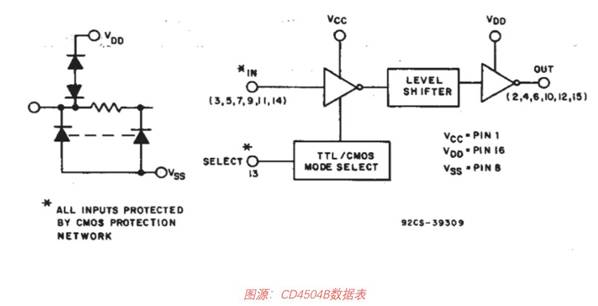 由上圖可以看出,TTL邏輯電平與CMOS邏輯電平之間存在差異,但是,我們通過分析發(fā)現,他們的電平在一定區(qū)間是有兼容性的,既然能兼容,那是不是可以不轉換,這是不可以的,這里舉個例子,以5VTTL和CMOS對比,比如一個信號速率為10GHZ,在TTL電平下,確定為高電平是2V以上,而在CMOS電平下,確定為高電平是3.5V以上,之間差了1.5V,我們都知道,信號的上升是需要時間的,在10G的速率下,這個確認電平的時間差值就非常重要,這個時間差會造成信號時序錯誤,終將導致信號傳輸失敗,所以TTL與CMOS邏輯電平之間也需要進行轉換,通常TTL轉CMOS需要使用專門的轉換芯片,例如CD4504B,它就可以實現TTL轉CMOS。