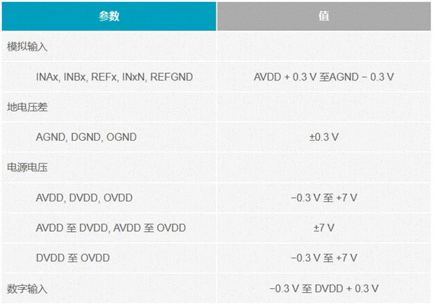 AD7794 Σ-Δ型24位ADC是另一個(gè)很好的例子。表3摘自AD7794 (Rev. D)數(shù)據(jù)手冊的“絕對最大額定值”部分。