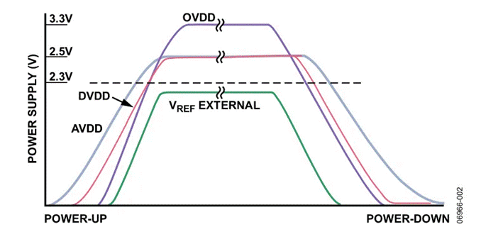 同樣,OVDD與DVDD之間存在限制!敖^對最大額定值”規(guī)定:OVDD必須小于或等于DVDD+0.3V,而DVDD則必須小于2.3V。一旦DVDD在上電期間達(dá)到2.3V,該限制便不再適用。如果不遵守該限制,AD7621(和AD7623)可能會(huì)受損(見圖1)。