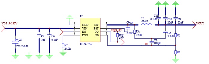 HTN77A0是一個同步降壓轉(zhuǎn)換器,具有從5V到130V的寬輸入電壓,集成了1.8Ω高側(cè) MOSFET和0.7Ω低端MOSFET。器件帶有0.84A峰值限流,可輸出持續(xù)0.7A。